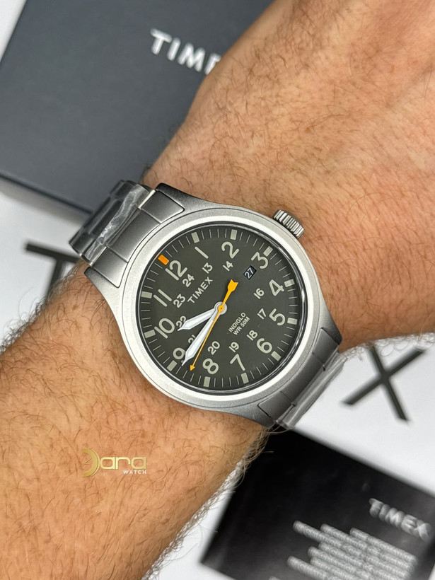ساعت مچی Timex با طراحی صفحه فیلد واچ و رنگ صفحه مشکی مات. دارای نور Indiglo جهت روشنایی یکنواخت صفحه، مقاوم در برابر آب تا عمق 50 متر و بند استیل نقرهای. مناسب برای استفاده روزانه و استایل کژوال.