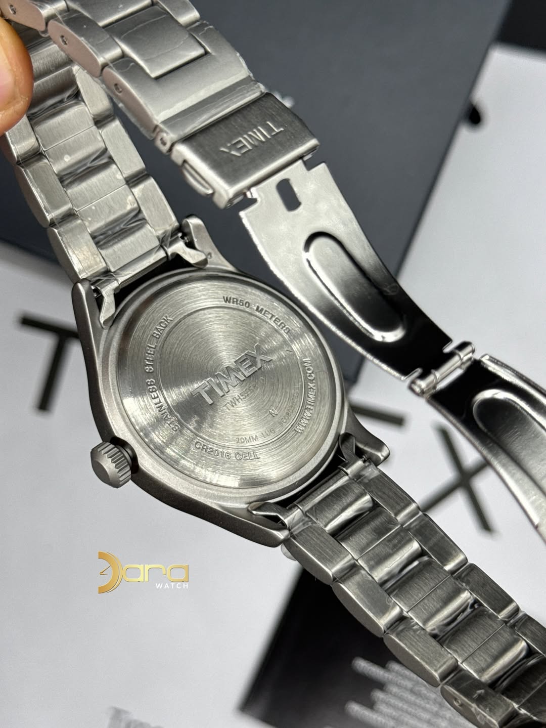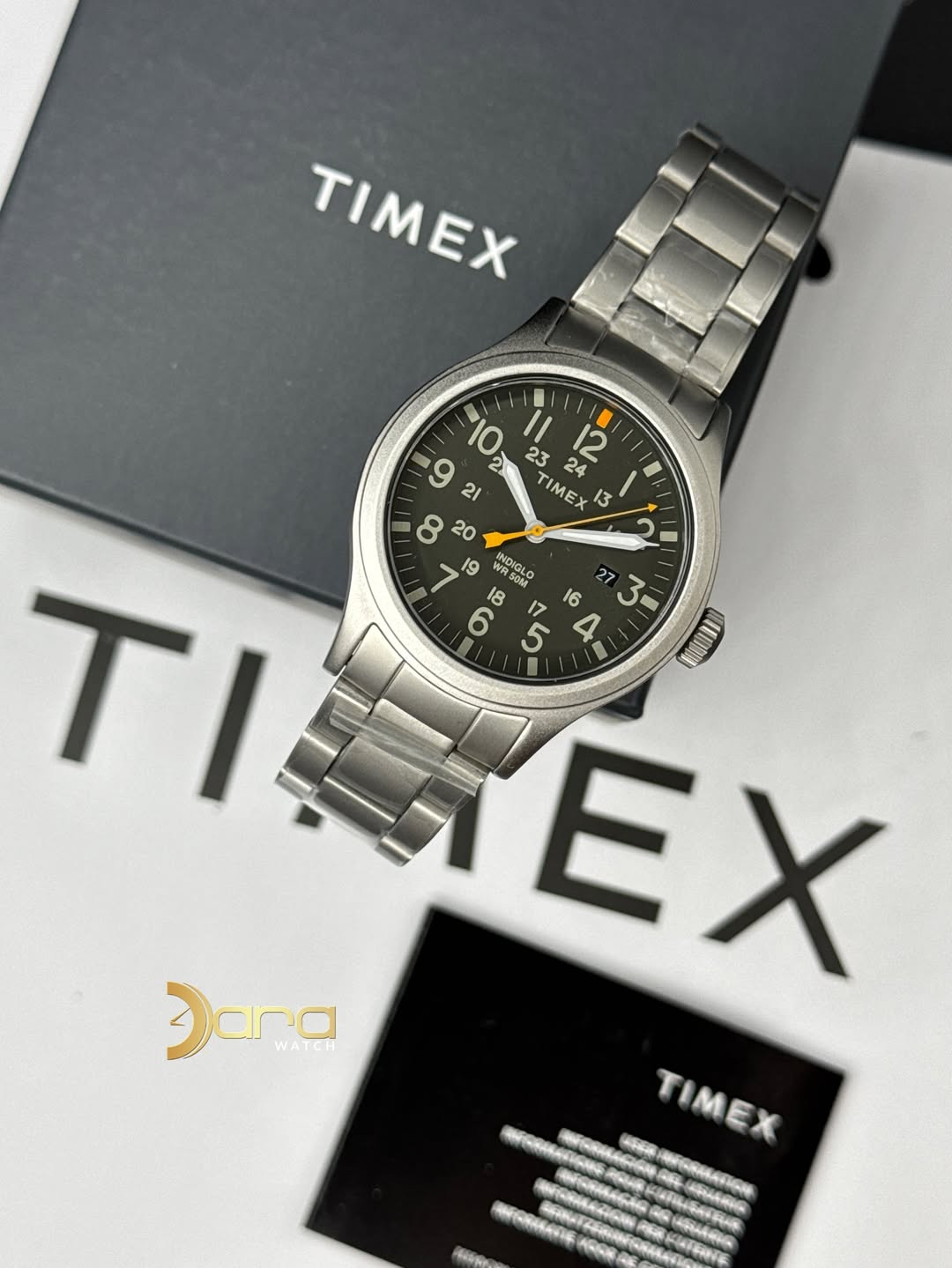 ساعت مچی Timex با طراحی صفحه فیلد واچ و رنگ صفحه مشکی مات. دارای نور Indiglo جهت روشنایی یکنواخت صفحه، مقاوم در برابر آب تا عمق 50 متر و بند استیل نقرهای. مناسب برای استفاده روزانه و استایل کژوال.